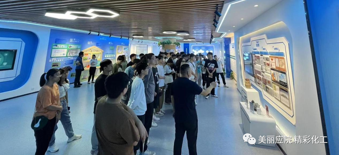 王传琪老师带领学生参观了现代化工职业体验中心,讲解了化工产业的发展史和河南地区的化工产业链及产业分布,让学生们从衣、食、住、行、医等多方面了解化工对社会做出的贡献。