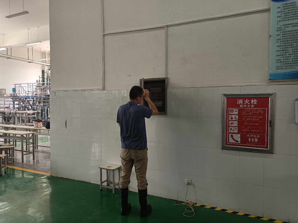 因买球体育化工综合实训中心位于2号实训类负一层,比校园的水平面低,且实训室内实训设备都是380V的动力电。演练模拟情景是:雨水顺着卷闸门和实训室墙体伸缩缝处流入室内,人员盲目进入实训室工作(如排涝),容易造成触电事故。