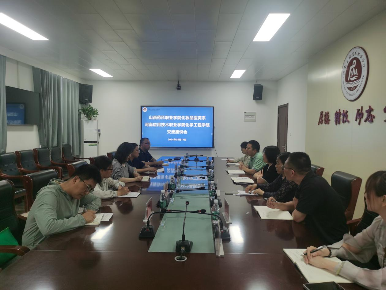 5月14日,山西药科职业学院化妆品医美系党总支书记范张姣、主任贾文雅,中药系主任蔡翠芳教授等一行5人到买球体育开展调研交流,买球体育党总支书记陈永惠,副院长岳瑞丰、柴凤兰出席,化妆品专业骨干教师参加了交流座谈。