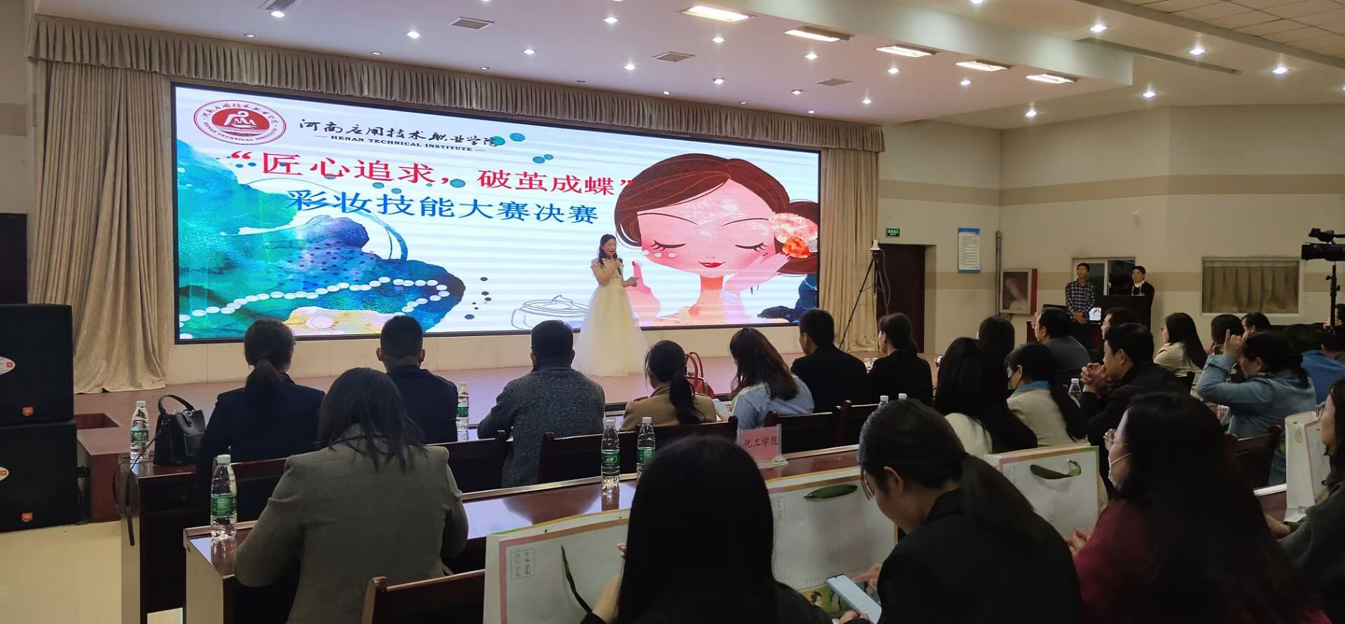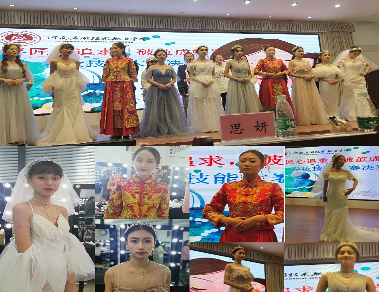 本次比赛由我校买球体育官方网站承办,邀请上海惠润升生物科技有限公司、合肥思妍商贸有限公司、河南浦康好女人生物科技有限公司、郑州西蒙妮尔化妆品有限公司等六家省内外知名企业同时参与,来自全校各院系的共10支参赛队进入决赛,接受现场校企专家共同考评,比赛以“匠心追求,破茧成蝶”为主题,以“新娘妆妆容造型”为命题,要求选手在规定时间内完成作品并展示。