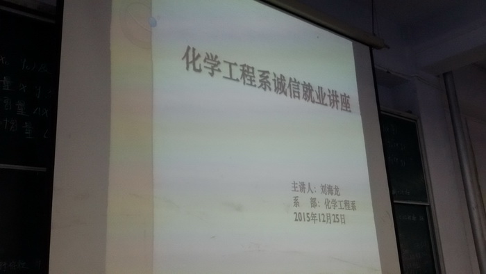 2015年12月25日,化工系组织二年级全体同学参加“校园狠磨练,职场好开端”系列专题讲座。此次系列讲座总结了历届毕业生择业、签约过程中暴露出的诸多问题,分专题进行,旨在引导二年级同学重视就业,逐步树立正确的择业观,并能够充分利用好假期做好社会调查和家庭沟通,为明年的就业工作奠定基础。此次,讲座由化学工程系党总支学生支部刘海龙老师担任主讲。