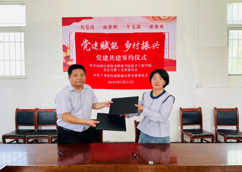 活动结束后,中共买球体育官方网站党总支教工支部委员会与中共兰考县红庙镇庙台村党支部委员会签订《乡村振兴技术帮扶协议》,推动专业与产业对接、教学过程与生产过程对接,在党建赋能乡村振兴的同时,进一步提升应用化工技术高水平专业群建设。买球体育官方网站党总支书记陈永惠、党总支副书记常惟诚、副院长岳瑞丰,协管员范雨欣及驻村第一书记任旭凯、队员李盈、陈开友等共同参与签约活动。