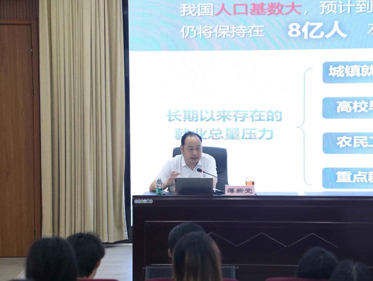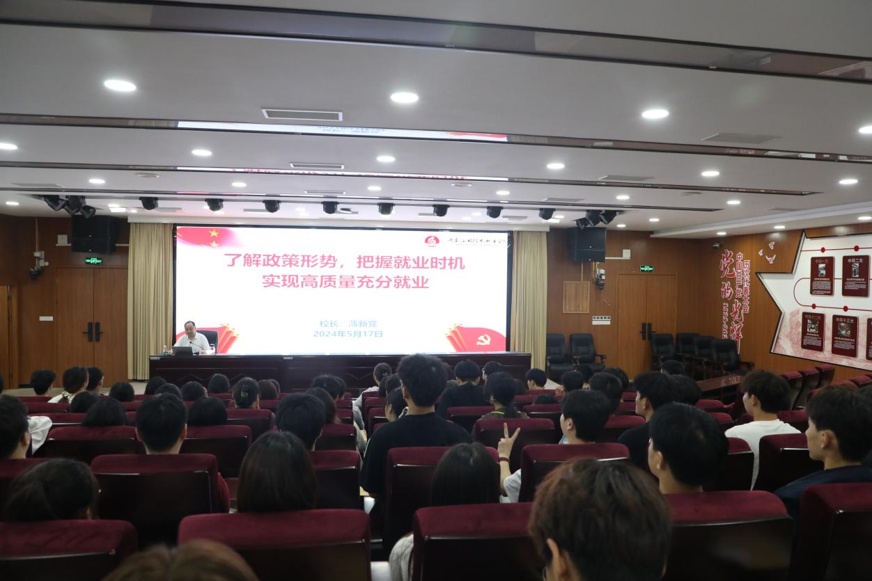 薄新党从就业形势概况、就业政策简析、就业路径建议等方面多角度深入解读国家当前的就业形势及相关支持政策,引导科学理性看待就业面临的问题与挑战。薄新党还详细介绍了我校推进高质量就业的措施和取得的成绩,通过客观详实的数据、鲜活生动的事例,勉励同学们增强信心、明确目标,坚决摒弃慢就业、缓就业、甚至不就业的观念,积极就业,扎根基层,磨练技能,在不懈奋斗中绽放出青年学子独有的绚丽青春之花。