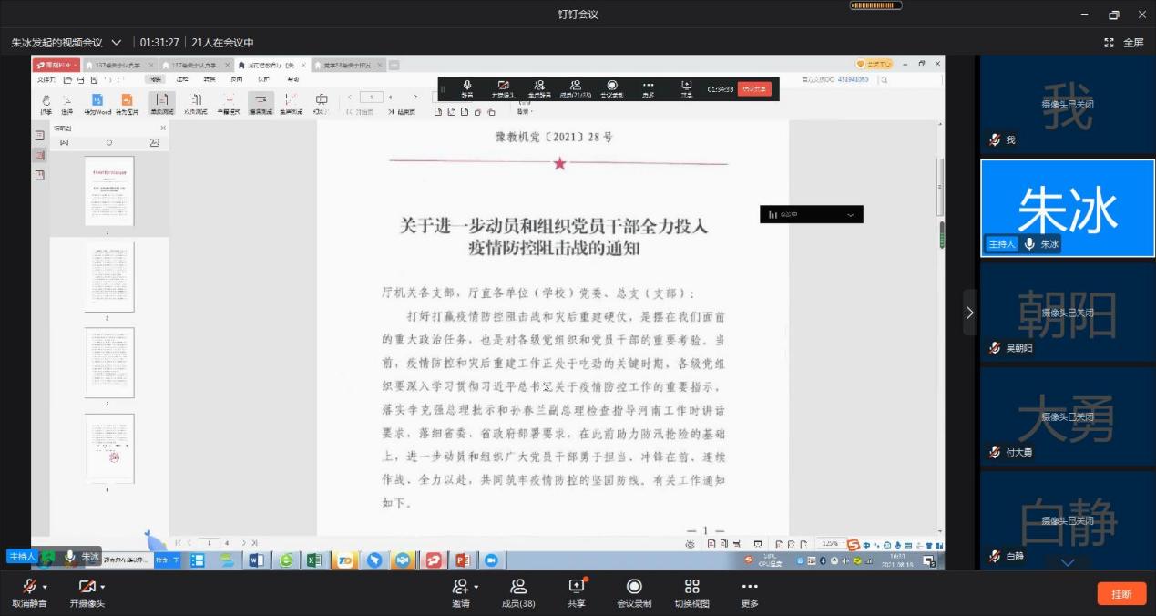 近期新郑州冠肺炎疫情形势变化,根据校党委要求,2021年8月18日,买球体育官方网站党总支组织召开了学习《关于进一步动员和组织党员干部全力投入疫情防控阻击战的通知》线上专题会议,学院全体教职工参会。会议由院长朱冰主持。