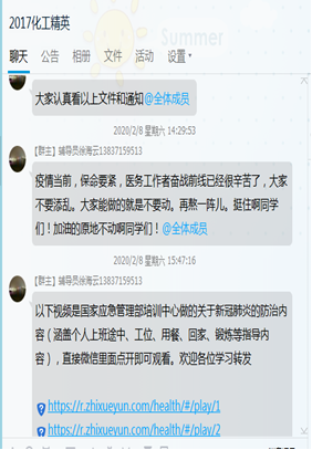 学院积极组织党员教师,发挥专业特长,制作微课,帮助大家解决家用消毒、温度测量等过程中的常见问题;组织辅导员坚守在网络一线,24小时守护在学生身边,用一句句日常的交流,缓和学生被困外地的焦虑,疏导学生宅在家里的急躁;组织全体教师收集和转发科普知识,积极互动,转发科普知识,防控网络舆情,引导学生不造谣、不信谣、不传谣。
