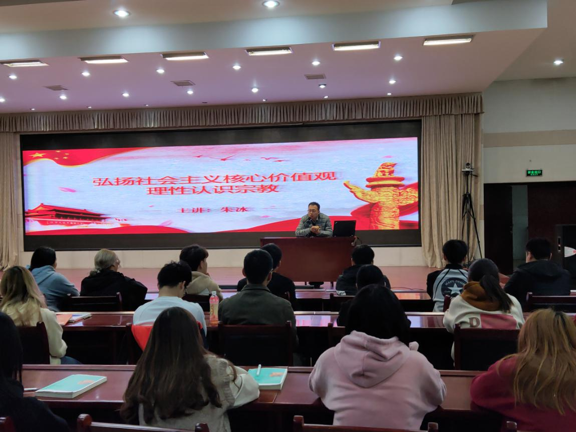 2019年11月21日,买球体育官方网站组织全体大一同学参加了《弘扬社会主义核心价值观理性认识宗教》的主题教育活动。此次活动,采取讲座形式开展,由党总支副书记朱冰老师主讲。