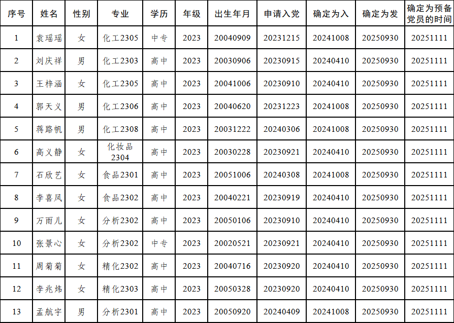 经过党组织的培养教育和考察,化工2305班袁瑶瑶等 13位同志已基本具备党员条件,在听取党小组、培养联系人、党员群众意见的基础上,经学工支部大会研究,将其列为预备党员,现将有关情况予以公示。