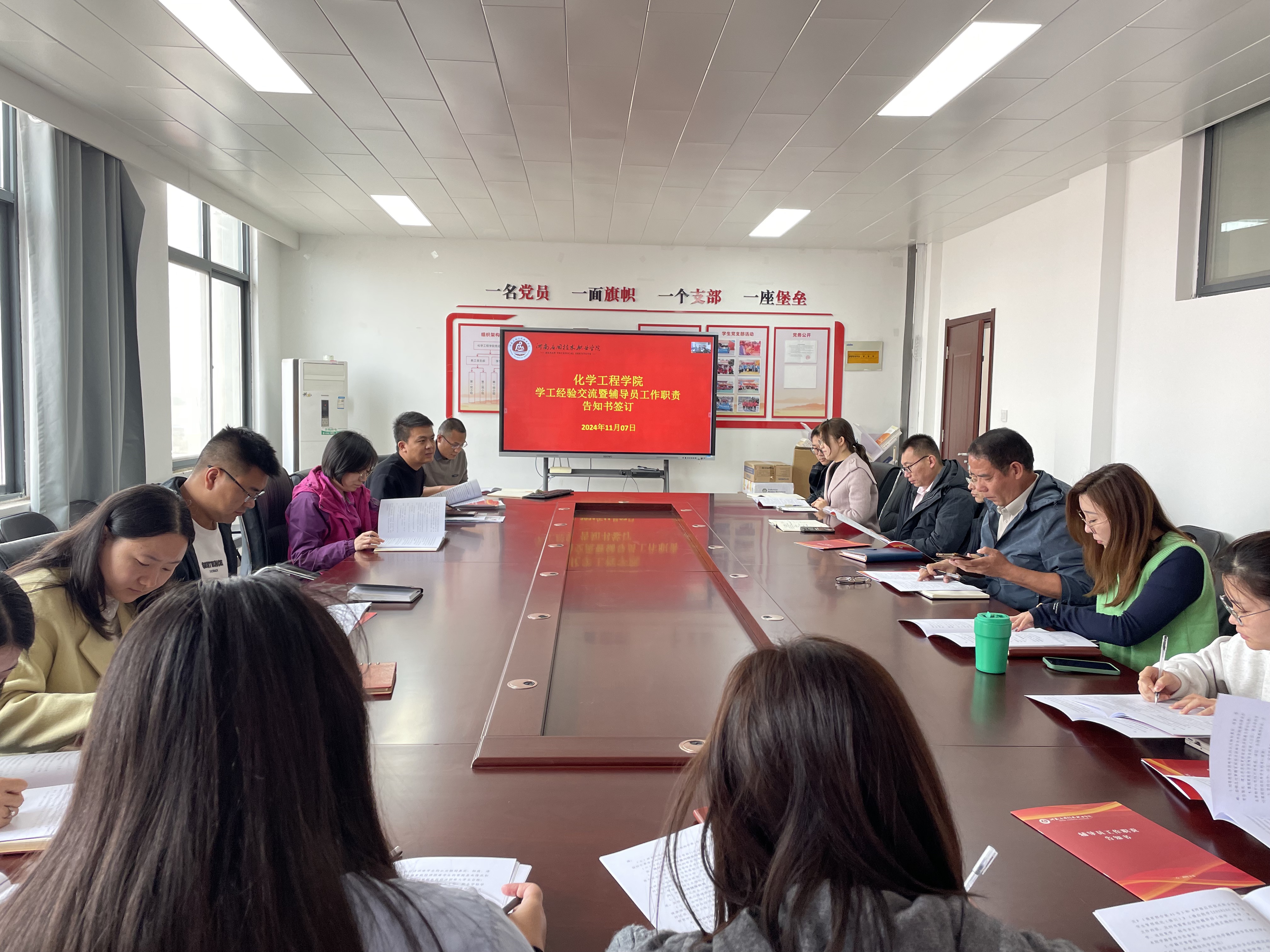 为了进一步提高辅导员的管理工作水平,加强辅导员之间的交流学习,同时明确工作职责,夯实辅导员队伍建设,学院在2024年11月7日在A512召开学工经验交流暨辅导员工作职责告知书签订会议。本次会议围绕学籍管理工作,资助工作、心理健康工作等主题展开,学院党总支书记陈永惠、党总支副书记常惟诚、以及全体专兼职辅导员参加会议,会议由常惟诚主持。
